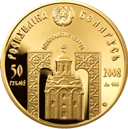 Аверс: вверху – рельефное изображение Государственного герба Республики Беларусь; в верхней части по кругу – надпись: РЭСПУБЛІКА БЕЛАРУСЬ; в центре – по кругу надпись: ПРАВОСЛАВНЫЕ СВЯТЫЕ; под ней на фоне орнамента изображение макета–реконструкции Спасо – Преображенского храма в Полоцке; слева – номинал: 50 РУБЛЁЎ на золотой и 10 РУБЛЁЎ на серебряной; справа – год чеканки, проба сплава и фирменный (товарный) знак Монетного двора Польши.